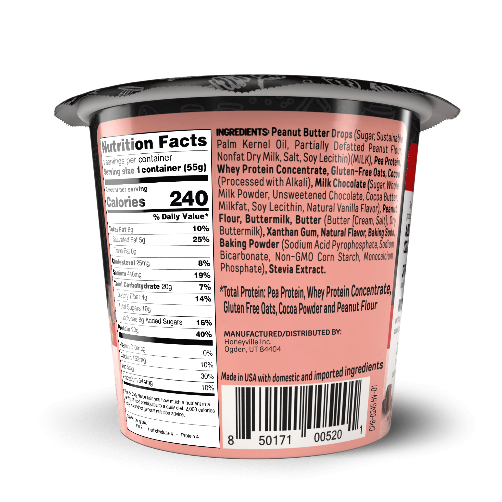 The FlapJacked Chocolate Peanut Butter Mighty Muffin is one to be desired. In a warm bed of chocolate cake, milk chocolate and melty peanut butter chips kiss the tongue with a sweet delight, delivering creamy goodness in every bite. With 20g of protein and just 8g of added sugar.